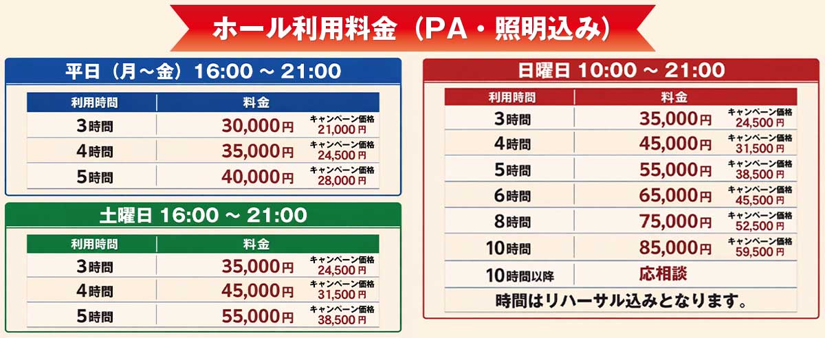 料金はすべて PA・基本照明込み(特殊照明・持ち込みPAは要相談)